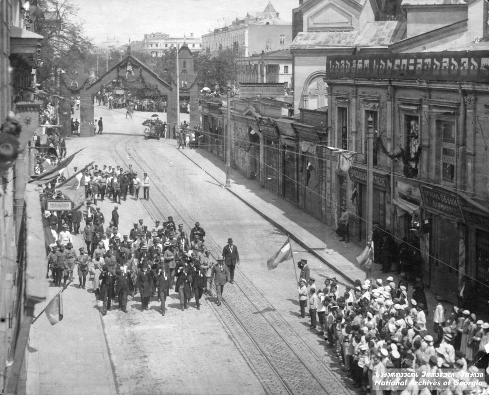 1919 წლის 26 მაისს დედაქალაქის ქუჩები მორთული იყო ეროვნული დროშებითა და ხალიჩებით, გაიმართა ფართომასშტაბიანი სამხედრო აღლუმი, არსენალის მთიდან გაისროლეს ზარბაზნები, ჰაეროპლანებმა დედაქალაქს რამდენჯერმე გადაუფრინეს, ჩამოყარეს საინფორმაციო ბიულეტენები და მისალოცები. სასახლიდან რუსთაველისა და წყნეთის ქუჩების (დღეს – ჭავჭავაძის გამზირი) გავლით მოეწყო მსვლელობა ვაკის მოედნისაკენ (დღეს – ვაკის პარკი).