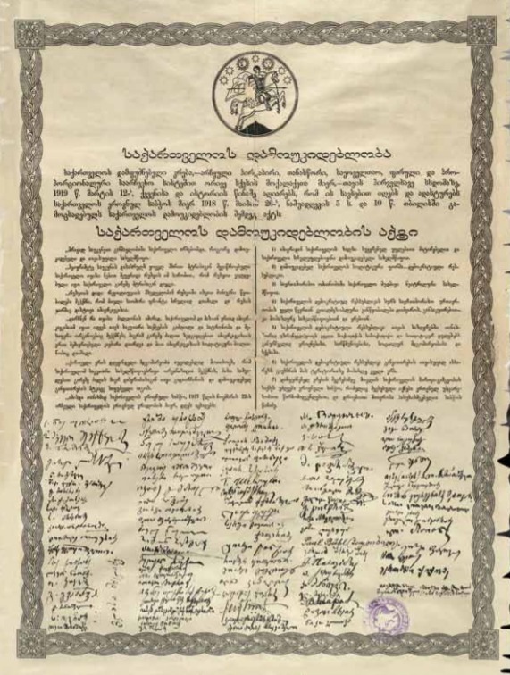 1918 წლის 26 მაისს, 17 საათსა და 10 წუთზე, ყოფილი მეფისნაცვლის სასახლეში ეროვნული საბჭოს თავმჯდომარემ ნოე ჟორდანიამ დამსწრეთა წინაშე საქართველოს დამოუკიდებლობის აქტი წაიკითხა, რომლის პირველივე მუხლი აცხადებდა – „ამიერიდგან საქართველოს ხალხი სუვერენულუფლებათა მატარებელია და საქართველო სრულუფლებოვანი დამოუკიდებელი სახელმწიფოა“.