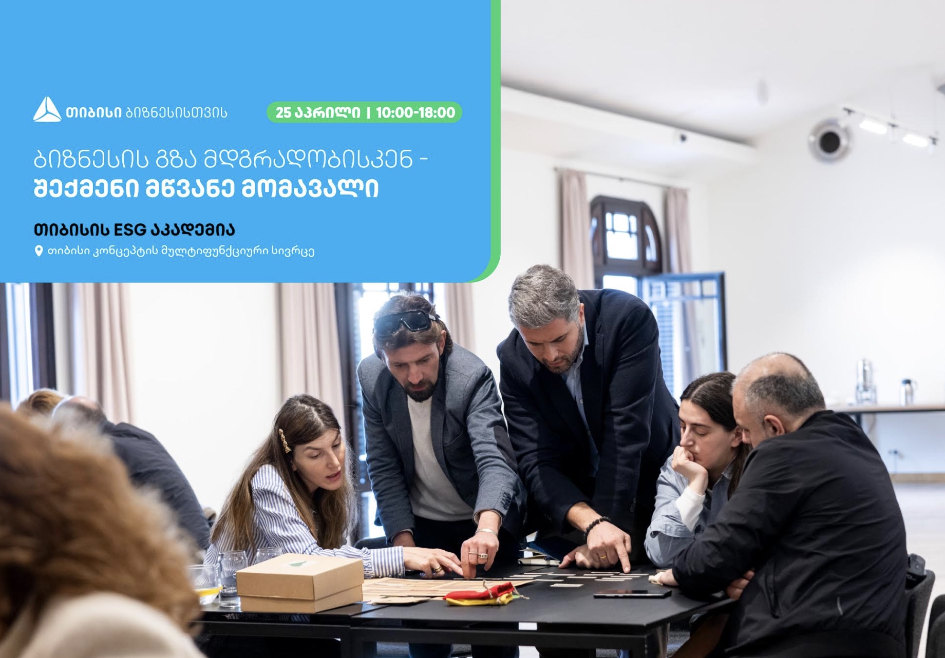 25 აპრილს, თიბისი კონცეპტის მულტიფუნქციურ სივრცეში, ბიზნესსექტორის წარმომადგენლებს შესაძლებლობა ექნებათ, დაესწრონ სპეციალურად მათ საჭიროებებზე მორგებულ ტრენინგს – „ბიზნესის გზა მდგრადობისკენ – შექმენი მწვანე მომავალი“.