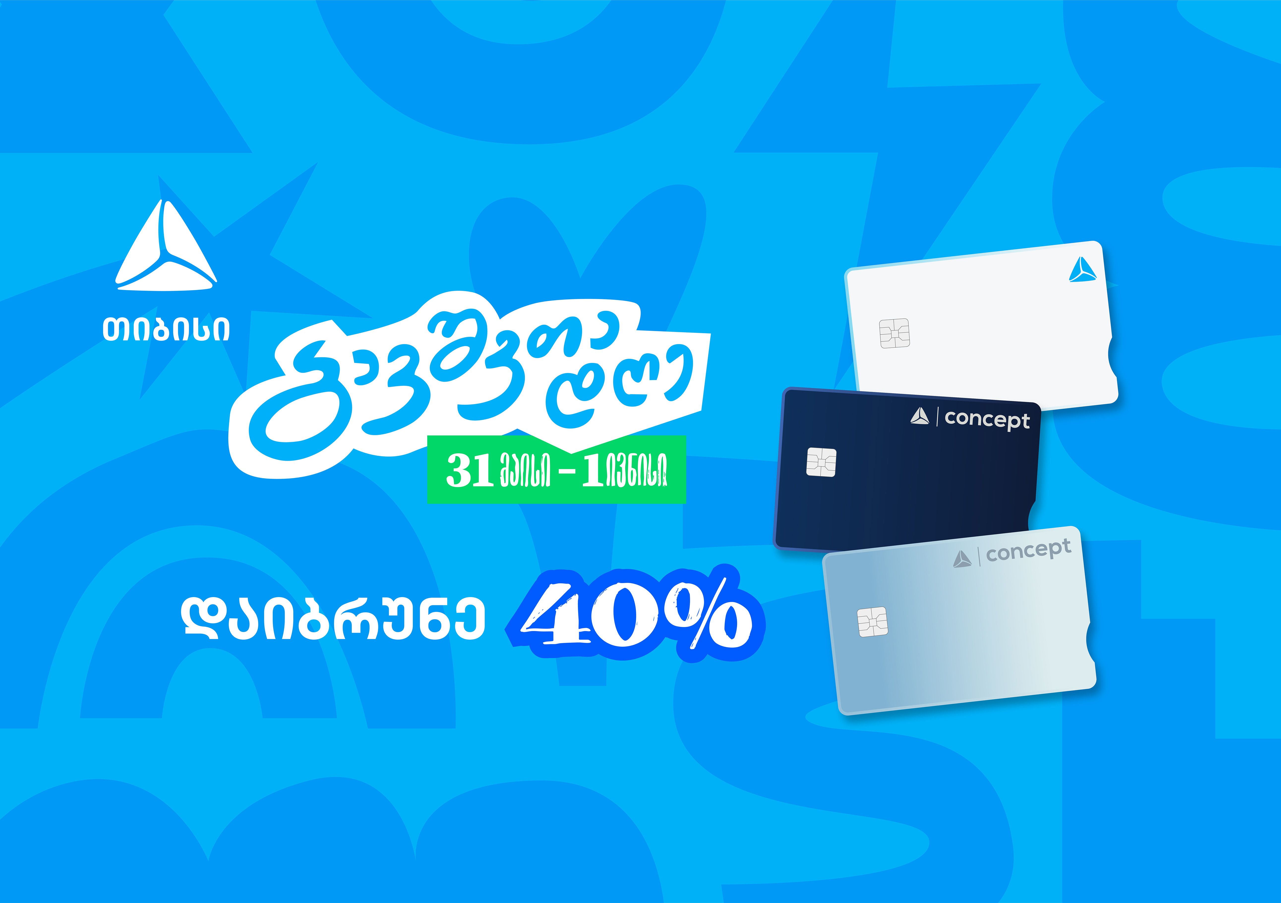 31 მაისსა და 1 ივნისს, 50-მდე ფიზიკურ თუ ონლაინ მაღაზიაში, ახალი თიბისი ბარათით, ახალი კონცეპტ ბარათებით ან ერთგული საკრედიტო ბარათით გადახდისას – 40% ქეშბექი დაგიბრუნდებათ. ახალი თიბისი ბარათისა და ერთგული საკრედიტო ბარათის მფლობელები ჯამში მაქსიმუმ 150 ლარს, ახალი თიბისი კონცეპტ ბარათების მომხმარებლები კი, 200 ლარს დაიბრუნებთ.
