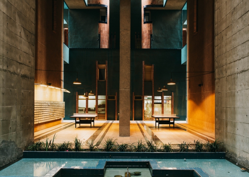 შენობა მთლიანობაში ჯვრის მსგავს გეომეტრიულ ფიგურას ქმნის. შენობის ფასადი წითელი ფერის სხვადასხვა ტონალობაშია შეღებილი, ხოლო კიბეები და სხვა შიდა კედლები ლურჯ ფერებშია გადაწყვეტილი.