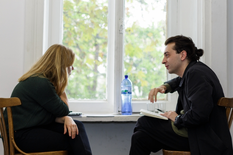 წარწერა კედელზე – „A specter that does not obey the passing of time“ – პირველია, რაც თვალში გვხვდება. ჩას ნამუშევარი რეპრესიული მეხსიერების და კოლექტიური ხსოვნის ურთიერთდაძაბულობას ასახავს, ის, რაც ასე მნიშვნელოვანი უნდა იყოს ქართველებისთვისაც და მოგვიანებით, ასევე თითქოს სიმბოლურად, ჩვენი დიალოგის ნაწილიც ხდება. საუბარს გერმანიაზე ვიწყებთ – კიოლნის და ბერლინის გამოცდილება, მეორე მსოფლიო ომის შემდეგ ამერიკული ხელოვნების პროპაგანდა და დიდი ქალაქების აჩქარებული ტემპი.