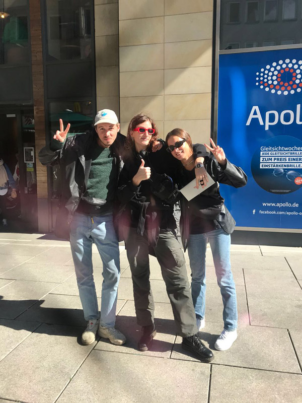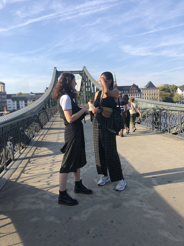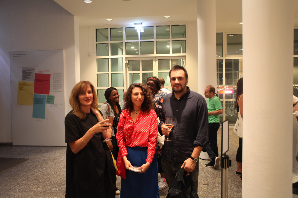 გამოფენის გახსნამდე მთავარ მოედანზე წავედით ყავის დასალევად, სადაც მეტროდან ამოსვლისთანავე ლადო ლომიტაშვილი და გვანცა ჯიშკარიანი შეგვხვდნენ, ნომრები გავცვალეთ და გახსნამდე დავემშვიდობეთ ერთმანეთს, შეხვედრისას, რა თქმა უნდა, ბევრი ვიცინეთ, ამხელა ფრანკფურტში ქართველები პირველ 10 წუთში შემთხვევით რომ შევხვდით ერთმანეთს (რეალურად ფრანკფურტი ძალიან პატარა ქალაქია). ხიდზე, სანამ გამოყენებითი ხელოვნების მუზეუმში მივიდოდით (Museum Angewandte Kunst), გამოფენის კურატორი მარეტიც შეგვხვდა, რომელმაც გვითხრა, რომ აღფრთოვანებულია ქართველი ხელოვანებით და ეს მისი ერთ-ერთი უსაყვარლესი გამოფენაა – რადგან თითქოს ამბებია პასუხების გარეშე, იმისათვის, რომ აღმოვაჩინოთ ისეთი ქვეყანა, რომელიც პასუხებზე მეტ კითხვებს გაგვიჩენს.