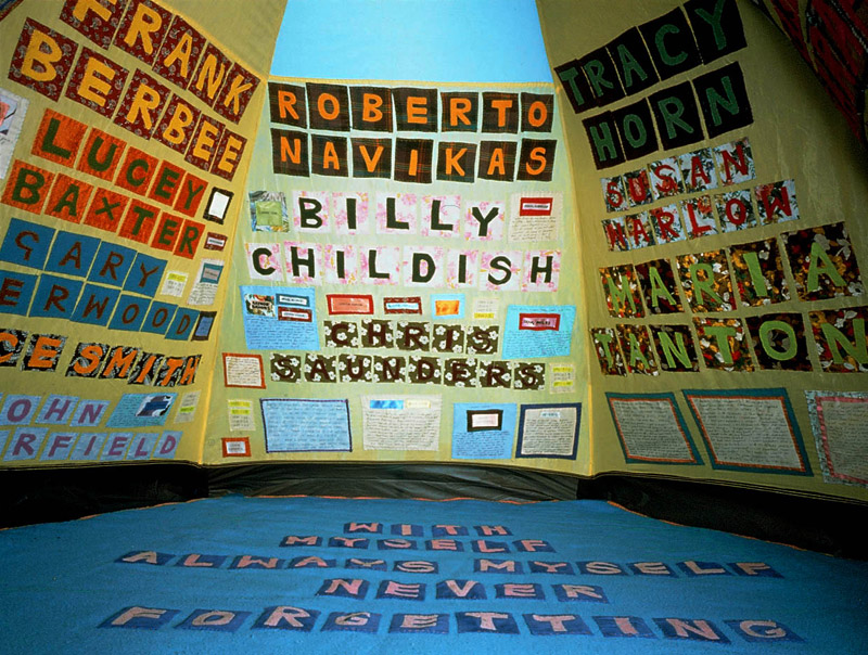 ამასთან, პატარა კარი და გზა, რომლითაც კარავში უნდა შევიდეს დამთვალიერებელი, რათა წაიკითხოს ამოქარგული სახელები, ძალიან დიდ ემოციურ კავშირს იწვევს ხელოვანთან, რადგან გვერდიგვერდ ძილი მეტად ინტიმურია, ვიდრე უბრალოდ სექსუალური კავშირი. სამწუხაროდ, ნამუშევარი ერთ-ერთი იმ მრავალთაგანია, რომელიც სააჩის გალერიის საწყობში მომხდარმა ხანძარმა გაანადგურა.