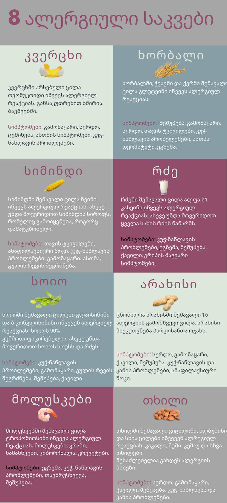 არსებობს 170-ზე მეტი ალერგიის გამომწვევი საკვები პროდუქტი, მათგან 8 ყველაზე გავრცელებულია.