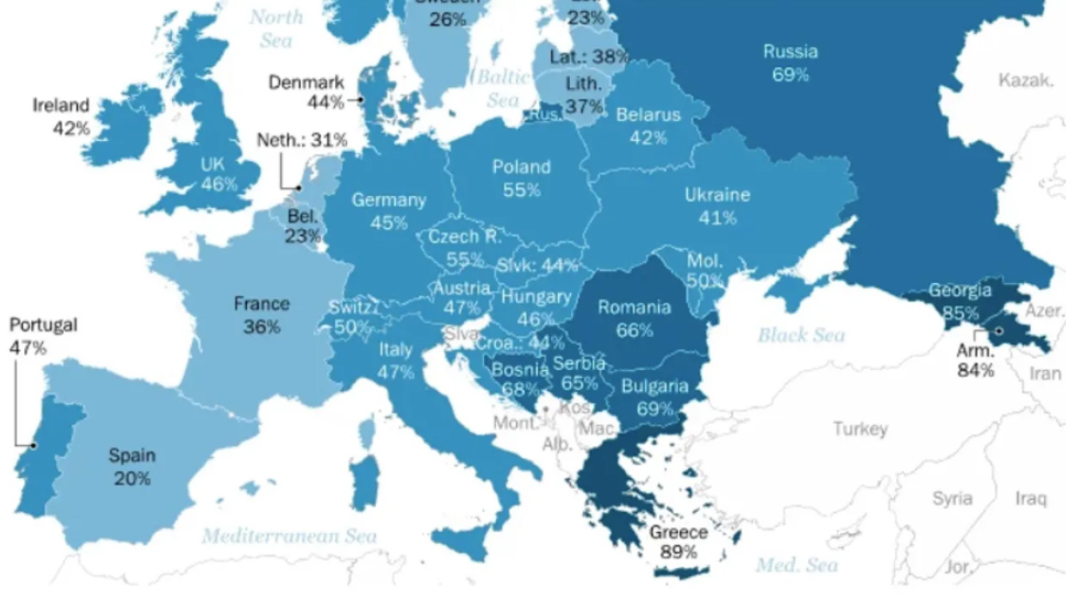 გამოკითხული ქვეყნების დიდი ნაწილის – 33-დან 13-ის – მაჩვენებლები 40 პროცენტის ფარგლებში მერყეობს. სიის ამ ქვედა ნაწილში ქვეყნების უმრავლესობა დასავლეთშია (8), ვიდრე აღმოსავლეთში (5) – თუ ცივი ომის დეფინიციებს გამოვიყენებთ.