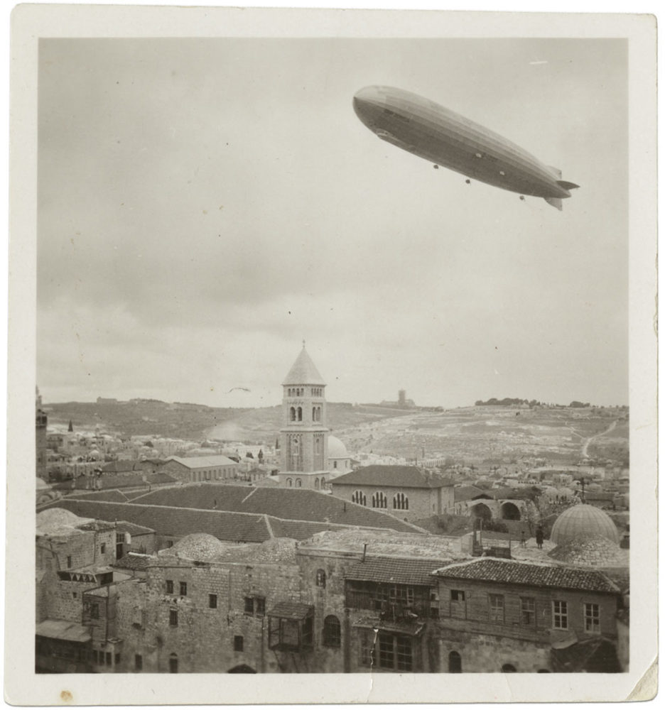 - „გინდერბურგის დირიჟაბლი იერუსალიმის თავზე“. 1936 წელი. უცნობი ავტორი