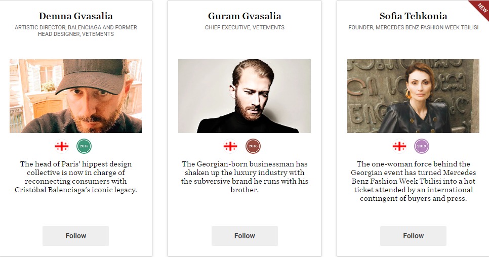 ესენი არიან – Balenciaga-ს სამხატვრო ხელმძღვანელი და Vetements-ის ყოფილი მთავარი დიზაინერი დემნა გვასალია, Vetements-ის აღმასრულებელი დირექტორი გურამ გვასალია და Mercedes Benz Fashion Week Tbilisi-ის დამფუძნებელი სოფო ჭყონია.