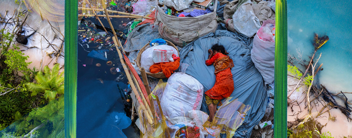 მძინარე ქალი დაბინძურებული მდინარის პირას.