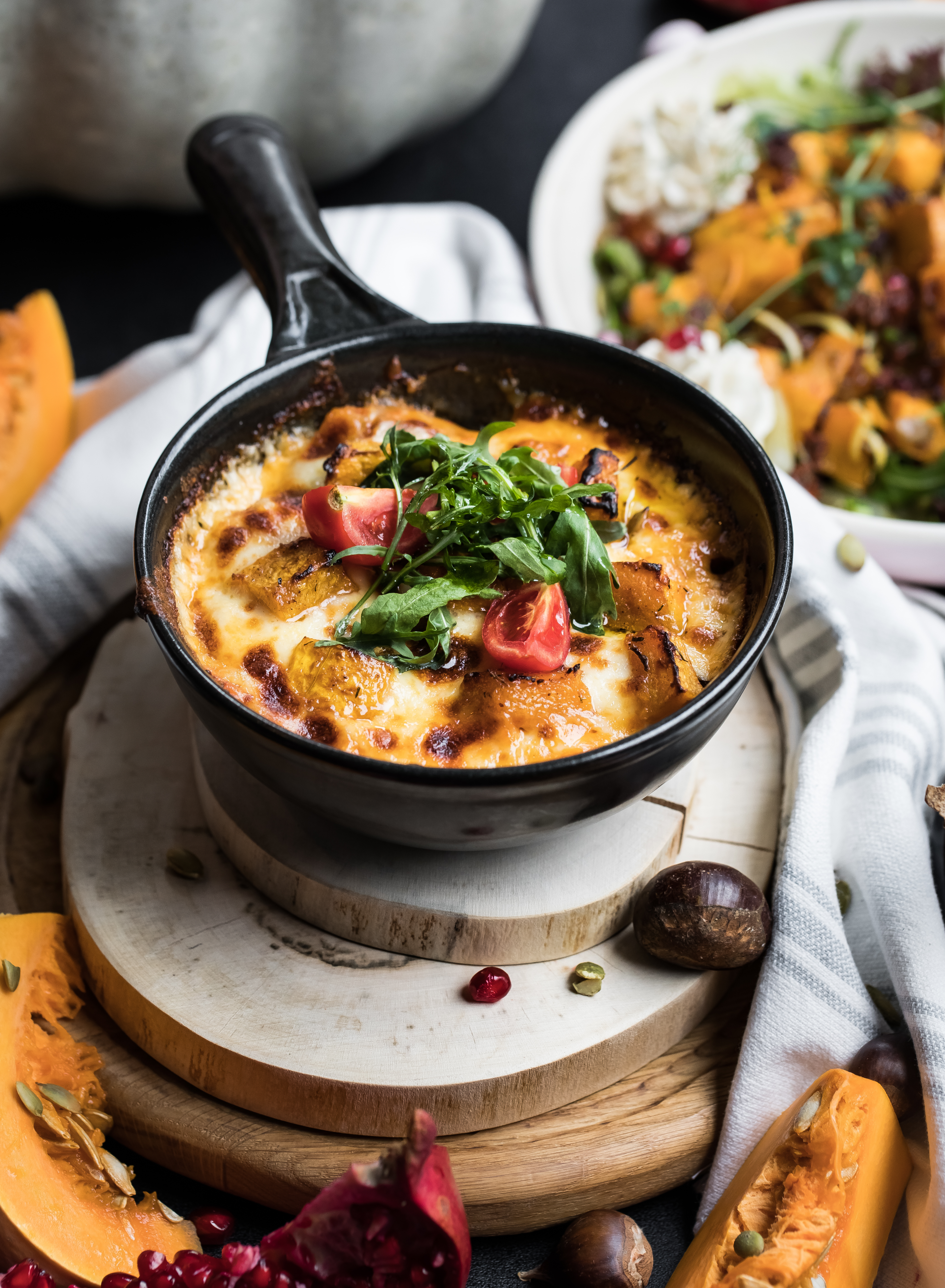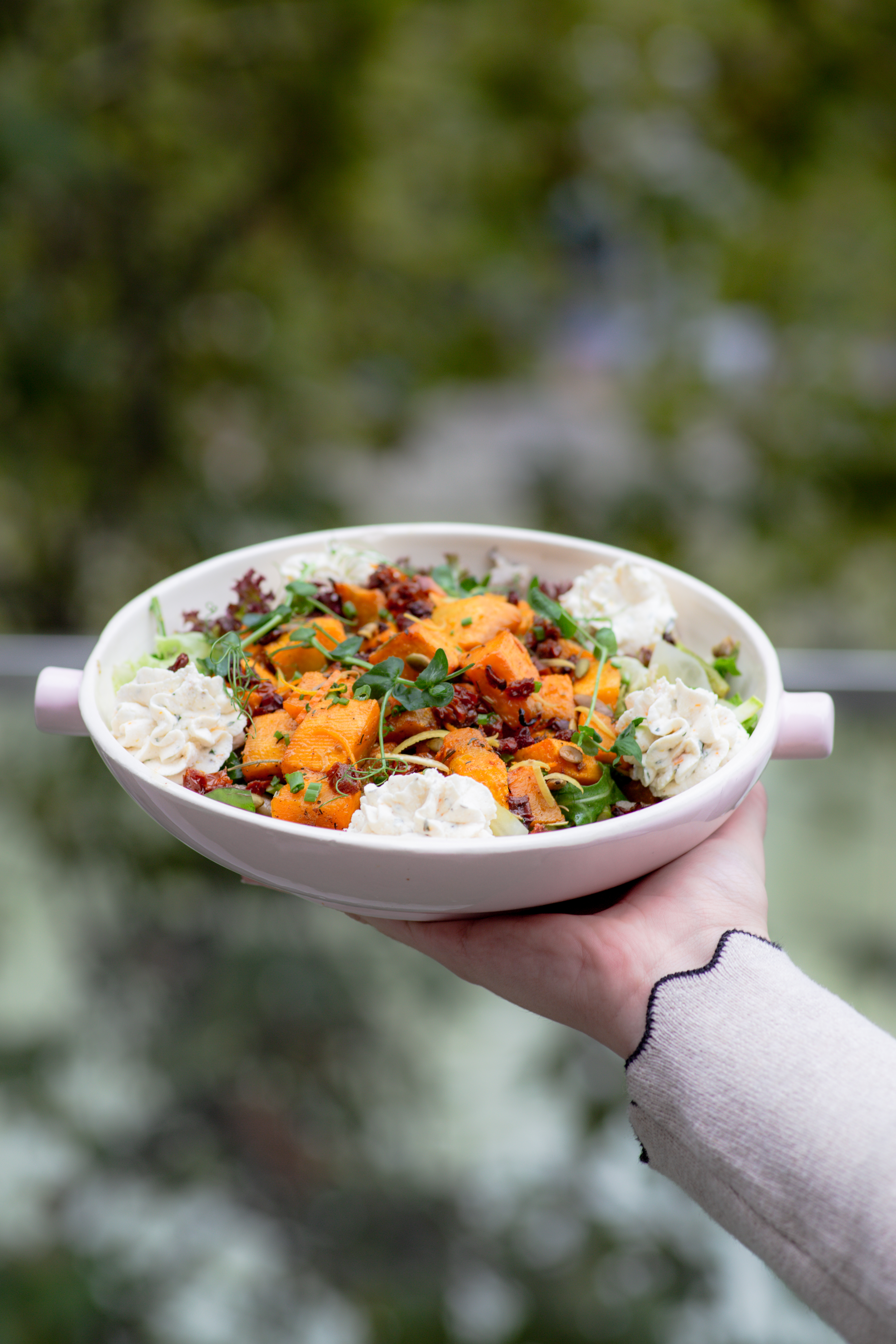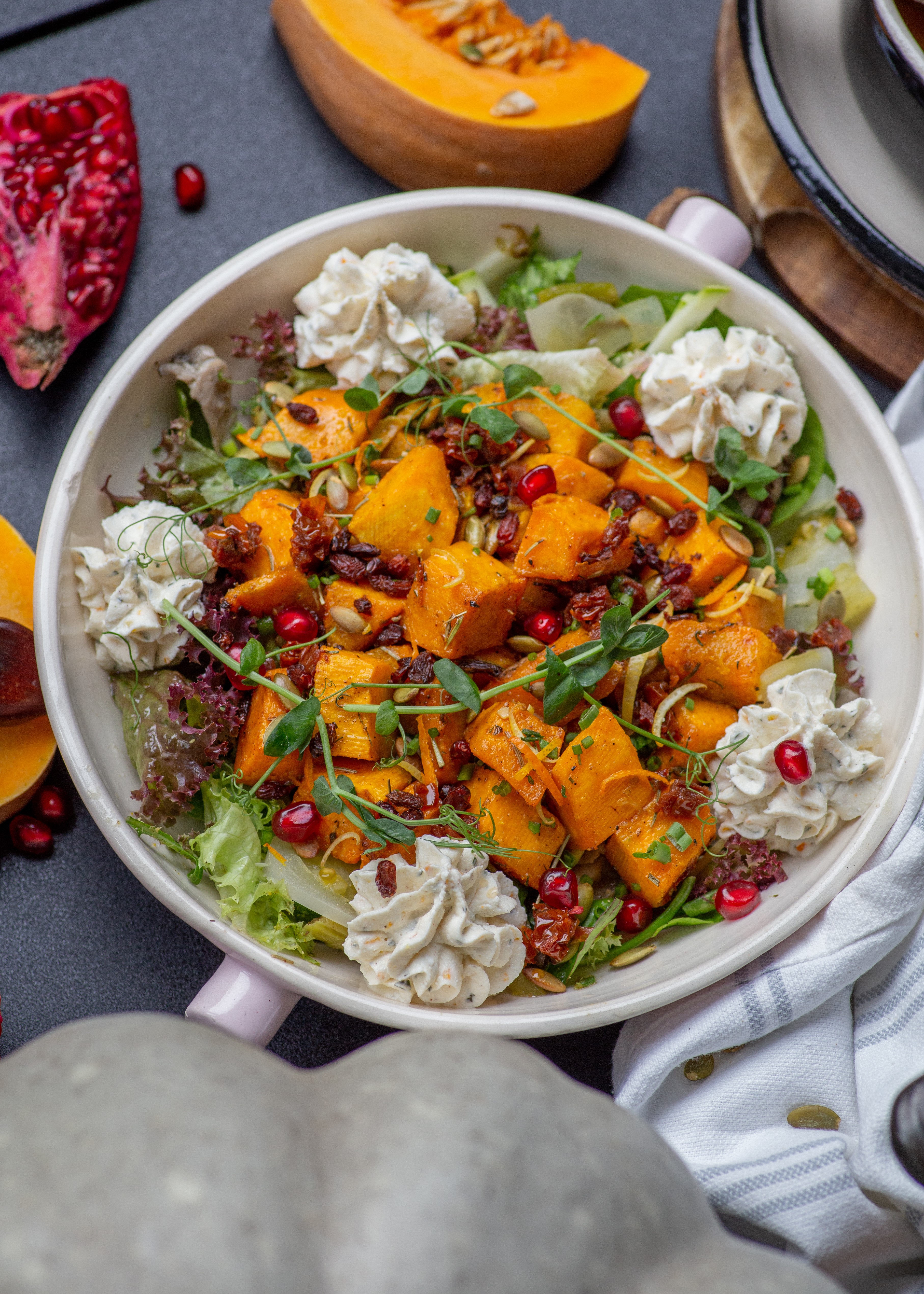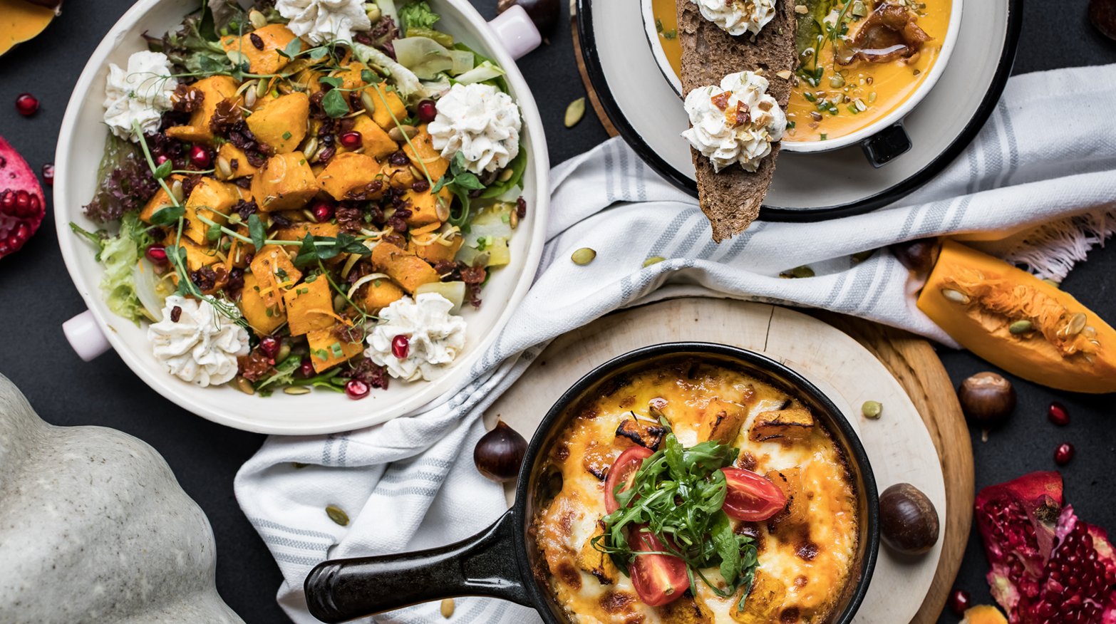 ეს სალათი სრულიად განსხვავებულია გემოებით და სხვებს არაფრით ჰგავს. თუ აქამდე არ გაგისინჯავთ, თქვენთვის ნამდვილი აღმოჩენა იქნება. სალათი ზაფხულისა და შემოდგომის ხასიათს იტევს და წელიწადის დროების მეტამორფოზის ნაწილად გაგრძნობინებთ თავს. სალათი გამომცხვარი გოგრის კუბებისგან მზადდება, რომელიც შესუნელებულია დარიჩინით, როზმარინით, ჯინჯერითა და ნივრით. კომპოზიციას, მაქსიმალური სიამოვნების მისაღებად, მჟავე მწვანე პომიდორი, ხის სოკო, სატაცური, ყაბაყი, კრემყველისა და ნადუღის პასტა, კოწახური და ბროწეული ემატება.