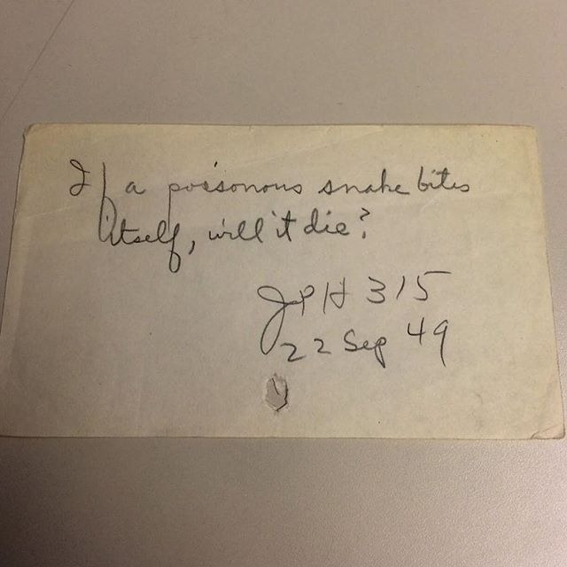 - “თუ შხამიანი გველი თავის თავს უკბენს, მოკვდება?”, 1949 წელი.