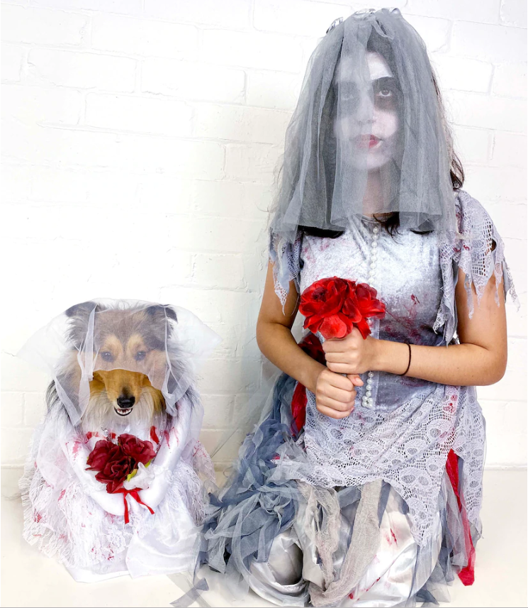 თავის ქალას თეთრი მაქმანებით, წითელი სისხლის ლაქებითა და მეწამული ვარდებით მოქარგული საქორწინო კაბა, პირბადე და თაიგული – სულ ესაა – თქვენ და თქვენს ძაღლს უკვე შეგიძლიათ გახდეთ მოსიარულე მკვდრები და შეაშინოთ ქორწილის სტუმრები!