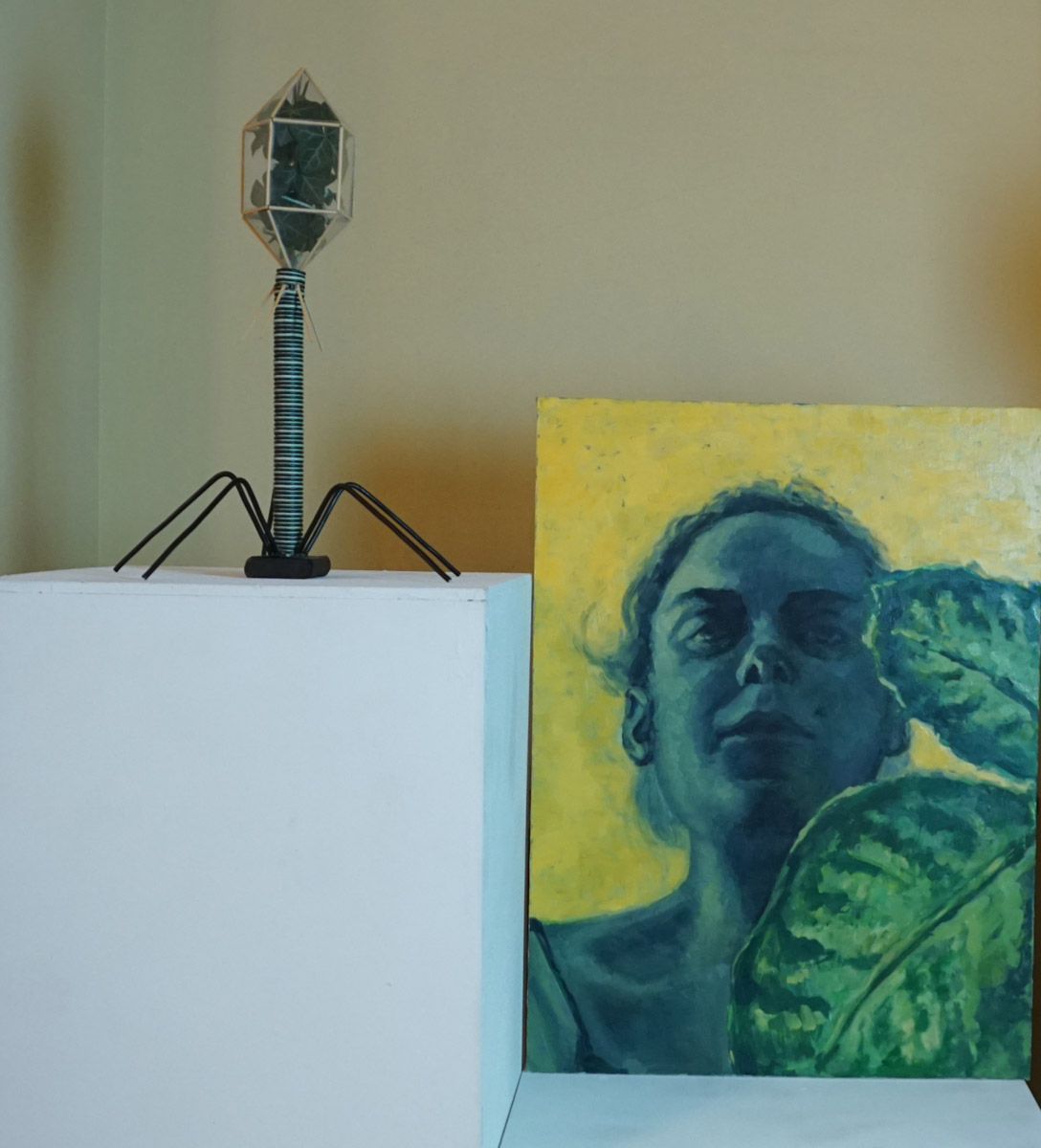 ეკოლოგიურ თემას ნატალია ლაშხის ინსტალაცია ავითარებდა – ბაქტერიოფაგის სტრუქტურის სკულპტურა მასში მოქცეული ცოცხალი მცენარითა და ფერწერული პორტრეტით მწვანე მოტივებზე.