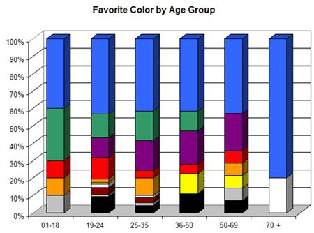 ასაკი: კვლევების მიხედვით, ჩვენ გვეცვლება ფერების მიმართ დამოკიდებულება ასაკის მატებასთან ერთად. გირჩევთ, გამოიყენოთ ქვემოთ მოყვანილი გრაფიკა: