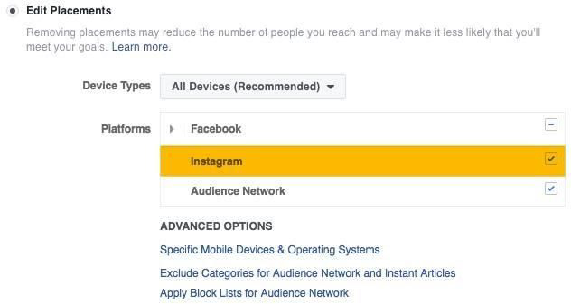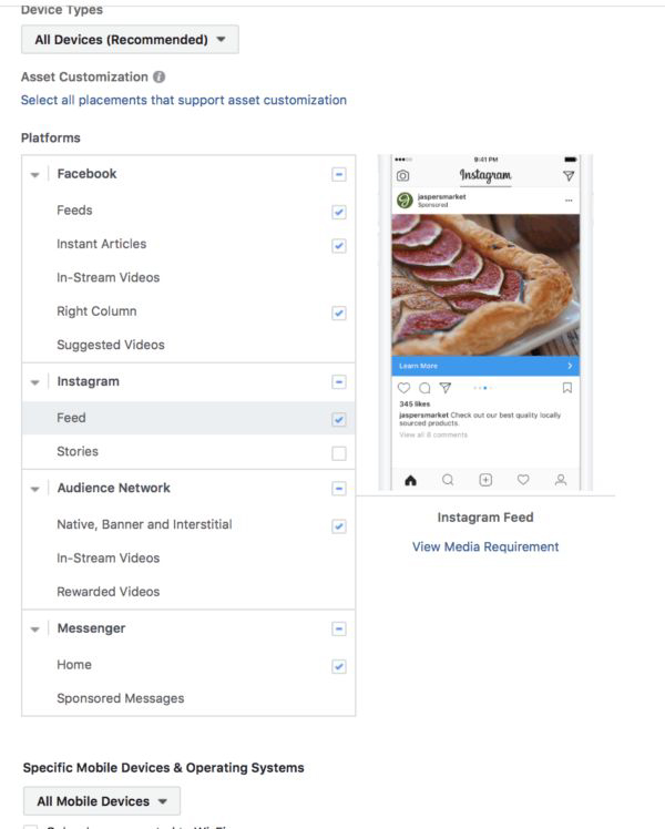 - ავტომატური განთავსება (Automatic Placement) – ამ შემთხვევაში ფეისბუქი ავტომატურად განათავსებს რეკლამას არსებულ ყველა პლატფორმაზე, რომელზეც თქვენი რეკლამის განთავსება არის ნებადართული.