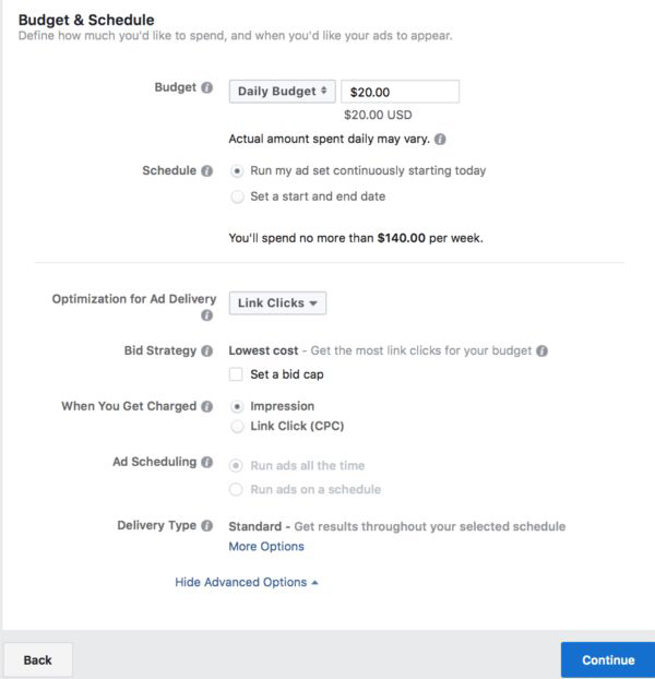- Lifetime Budget – “ცხოვრების”, ე.წ. ხანგრძლივი ბიუჯეტი, რომლის დროსაც არ ხართ შეზღუდული 24 საათით და შეგიძლიათ განსაზღვროთ როდის დაიწყება და დამთავრდება რეკლამა.