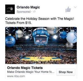 NBA-ის გუნდ Orlando Magic-ს სურდა თამაშის ბილეთების პოპულარიზაცია და გაყიდვა, ამისთვის გამოიყენეს არსებული ბაზა. მათ სამიზნე აუდიტორიას წარმოადგენდა 18-ისა და უფრო მეტი ასაკის ადამიანები, რომელთა ინტერესებიც მოიცავდა თამაშის პირდაპირ ეთერში ყურებას, კალათბურთს და თავად Orlando Magic-ის გულშემატკივრები იყვნენ. შედეგად, სხვა სარეკლამო არხებისგან განსხვავებით, ფეისბუქიდან 84%-ით მაღალი ინვესტიციების ბრუნვა (ROI) მიიღეს.