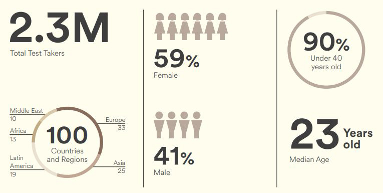 2,3 მილიონი მონაწილე, მათგან 59% ქალი, ხოლო 41% მამაკაცი. საშუალო ასაკი – 23 წელი. კვლევის მონაწილეთა 90% 40 წლამდე ასაკისაა.