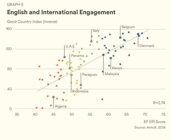 ინგლისური ენის მაღალ დონეზე ცოდნა ურთიერთკავშირშია მთლიანი შიდა პროდუქტის, წმინდა შემოსავლისა და პროდუქტიულობის ზრდასთან. განვითარებად ქვეყნებში ცოდნაზე დაფუძნებულ ეკონომიკაზე გადასვლა მოითხოვს როგორც შესაბამის ინფრასტრუქტურას, ასევე გამოცდილ სამუშაო ძალას, რომელთაც მომსახურების შეთავაზება საერთაშორისო დონეზე შეუძლიათ. ამისთვის აუცილებელია განათლებაზე ფოკუსირება. D გრაფიკში იხილავთ ადამიანური კაპიტალის განვითარებასა და ინგლისური ენის ცოდნის ინდექსს შორის ურთიერთკავშირს . უცხო ენის ცოდნა არა მარტო ამარტივებს ურთიერთობას, არამედ ნდობასაც წარმოშობს. ეკონომისტ პანკა ღემავატის შეფასებით, ის ქვეყნები, რომლებიც ერთ ენაზე საუბრობენ, 42%-ით უფრო კარგად ვაჭრობენ, ვიდრე ისინი, რომლებიც განსხვავებული კომუნიკაციის ენას იყენებენ.