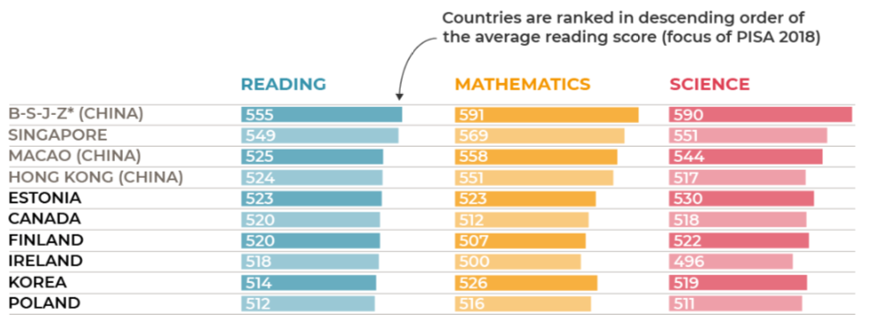 პიზას კვლევაში საუკეთესო მაჩვენებლებით პირველ 5 ადგილს იკვებს ჩინეთი, სინგაპური, ესტონეთი, კანადა და ფინეთი. უცხოური მედია ხსნის ესტონეთის ყოფნას მოწინავე პოზიციაზე სხვა, ეკონომიკურად უფრო ძლიერი ევროპული ქვეყნების თავში. BBC-ს თანახმად, ესტონეთში ადრეული განათლება სახელმწიფო პრიორიტეტს წარმოადგენს და ბავშვი, რომელიც სკოლაში მიდის, უნდა ფლობდეს მოწმობას იმის დასადასტურებლად, რომ ის ემოციურად და გონებრივად მზად არის სასკოლო განათლებისთვის.