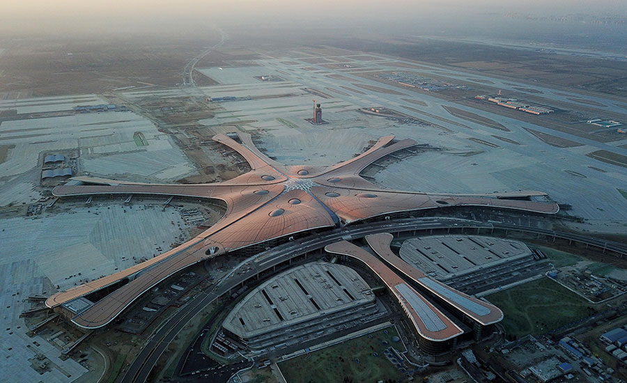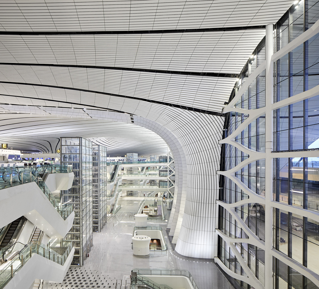 - საერთაშორისო აეროპორტი „პეკინი დასინი“. Zaha Hadid Architects-ის პროექტი. შენობის ყველა სართულის ფართობი ჯამში 700 ათასი კვადრატული მეტრია. ნაგებობა წარმოადგენს ხუთქიმიან კონსტრუქციას, რომლის ე.წ. ქიმები თემატურადაა შექმნილი და ეხმიანება ჩინური კულტურის ისეთ ელემენტებს, როგორებიცაა: ტრაფარეტული ბეჭდვა, ჩაი, ფაიფური, სოფლის მეურნეობა და ჩინური ბაღები.