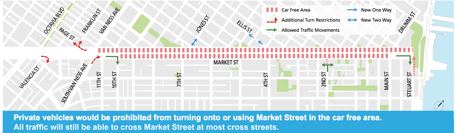 “უკეთესი მარკეტ სტრიტის” გეგმის შეფასებით ყოველდღიურად ქუჩაზე 500 ათასამდე ადამიანი გადაადგილდება, ხოლო პიკის საათში მას 650 ველოსიპედისტი და 200 ავტობუსი კვეთს. გეგმის მიხედვით, მანქანების აკრძალვის შედეგად მარკეტ სტრიტი უნდა გახდეს არა მხოლოდ უკეთესი მარშრუტი საზოგადოებრივი ტრანსპორტისთვის, არამედ ასევე “ადგილი, სადაც ადამიანებს ექნებათ გაჩერების, დროის გატარების, მეგობრებთან შეხვედრის, კაფეში ჩამოჯდომისა და სეირნობის სურვილი.”