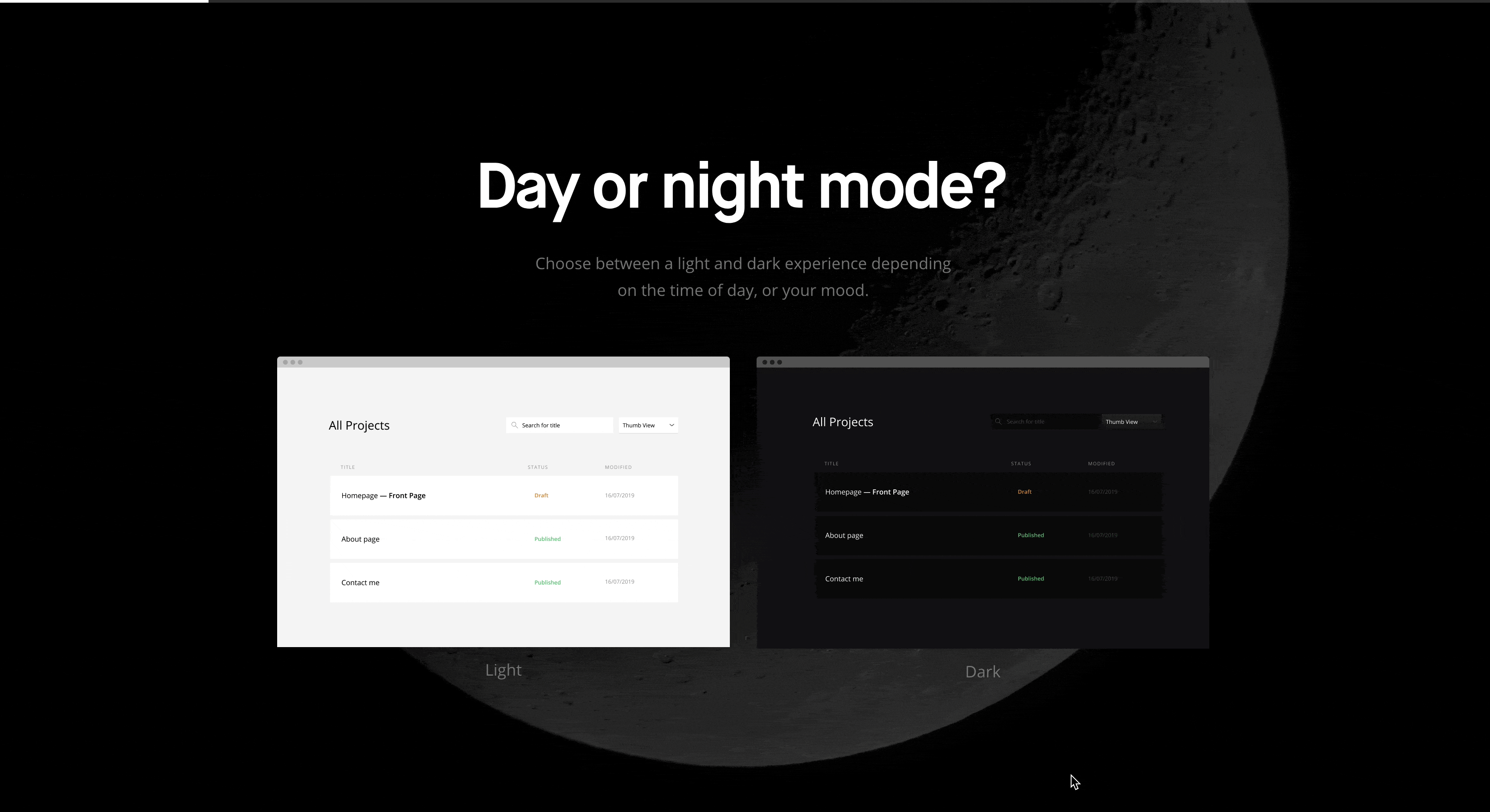 Dark Mode, იგივე მუქი დიზაინი, მთლიანად ცვლის UI (მომხმარებელთა კავშირს) მოწყობილობებთან. ასეთი დიზაინი ფერთა მინიმალური კონტრასტის დახმარებით ამცირებს ეკრანის სინათლის გამოსხივებას, რაც ზრდის ფრაგმენტების გარჩევადობასა და ვიზუალის ერგონომიულობას. მარტივად რომ ვთქვათ, მუქი დიზაინის დახმარებით, ყველაფერი უფრო მარტივად გარჩევადი და მიმზიდველია, თანაც ნაკლებად შემაწუხებელი.