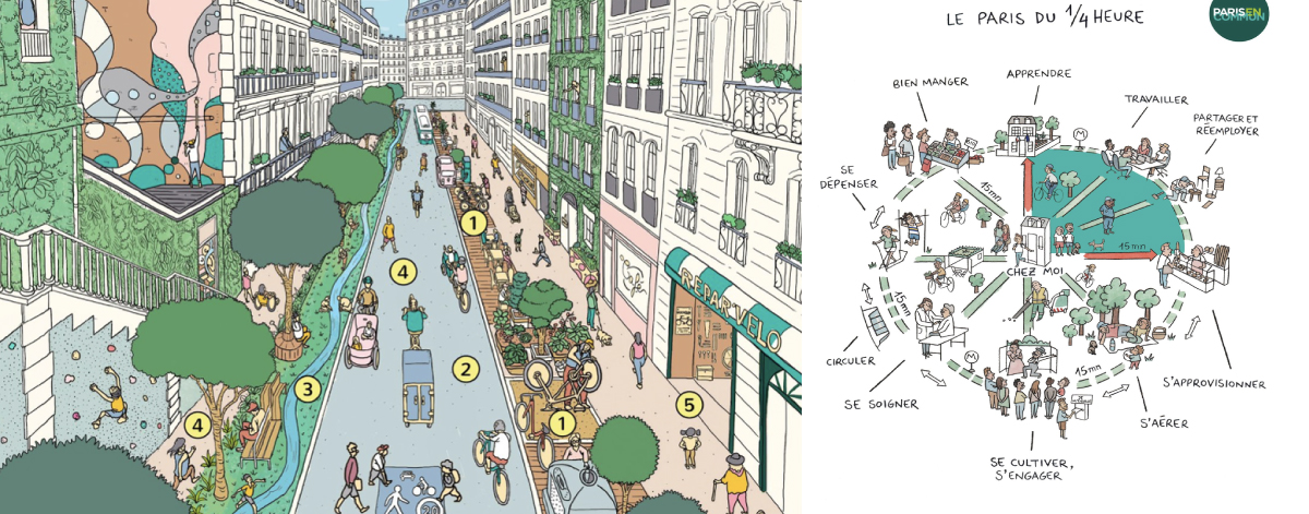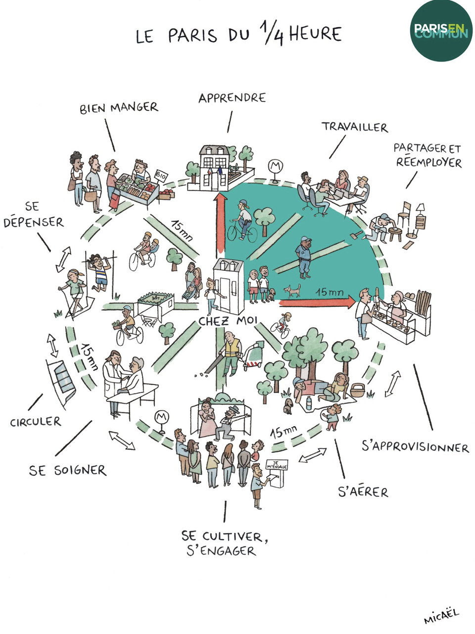 პარიზის მერი ანე ჰიდალგო გეგმავს, რომ ქალაქი აქციოს ისეთ ადგილად, სადაც ადამიანები სახლიდან 15 წუთის სავალზე შეძლებენ იპოვონ ყველაფერი, რაც დასჭირდებათ. ამასთან ერთად, მერი იმედოვნებს, რომ მოსახლეობა მანქანით მგზავრობის ნაცვლად, ველოსიპედით ან ფეხით სიარულს ამჯობინებს.
