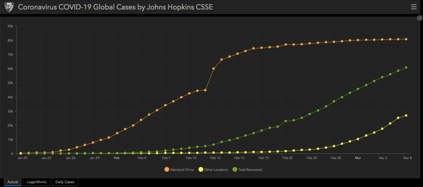გავრცელებული მონაცემების დიდი ნაწილი უკავშირდება დადასტურებული შემთხვევების რაოდენობასა და დაღუპულთა რიცხვის ზრდას, მაგრამ ინფიცირებულთა უმეტესობა განიკურნა. განკურნებულთა რაოდენობა 13-ჯერ მეტია, ვიდრე გარდაცვლილთა და ეს პროპორცია იზრდება.
