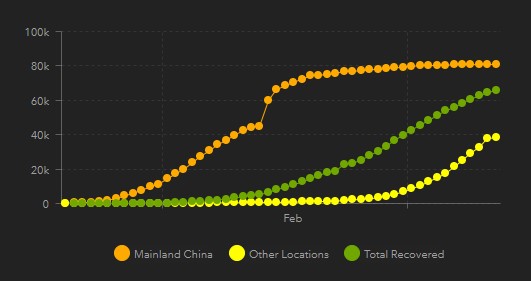 განკურნებული შემთხვევების გრაფიკი ასე გამოიყურება (ნარინჯისფერი – ჩინეთი, მწვანე – დანარჩენი მსოფლიო, ყვითელი – ყველა ერთად)