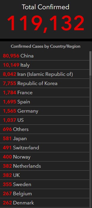 ამჟამად ვირუსით ინფიცირებულია 119132 ადამიანი, გარდაიცვალა 4284, განიკურნა 65776 ადამიანი.