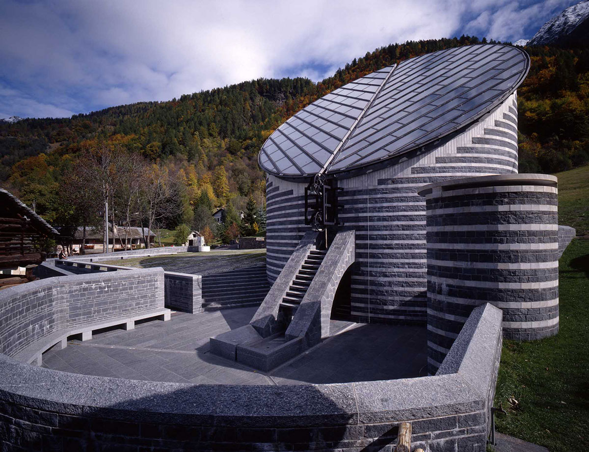 მარიო ბოტას ნაგებობა მე-17 საუკუნის ეკლესიის ადგილზე აშენდა, რომელიც 1986 წელს ზვავის შედეგად დაინგრა და მხოლოდ ზარი გადაურჩა განადგურებას. არქიტექტორმა მასალად თეთრი მარმარილო, ადგილობრივი გნაისი და ნაცრისფერი გრანიტი გამოიყენა.