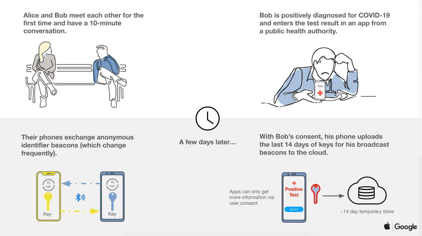 ჯანდაცვის საჯარო ორგანოების ოფიციალურ აპლიკაციებს ამ მონაცემებზე წვდომა ექნებათ და მომხმარებლებს, რომლებიც ამას ჩამოტვირთავენ, შეუძლიათ აპლიკაციაშივე აღნიშნონ, რომ COVID-19 დიაგნოზი დაუსვეს. სისტემა ხალხს გაფრთხილების სიგნალს მისცემს იმ შემთხვევაში, თუ ინფიცირებულ ადამიანთან ახლო კონტაქტში იქნებიან.