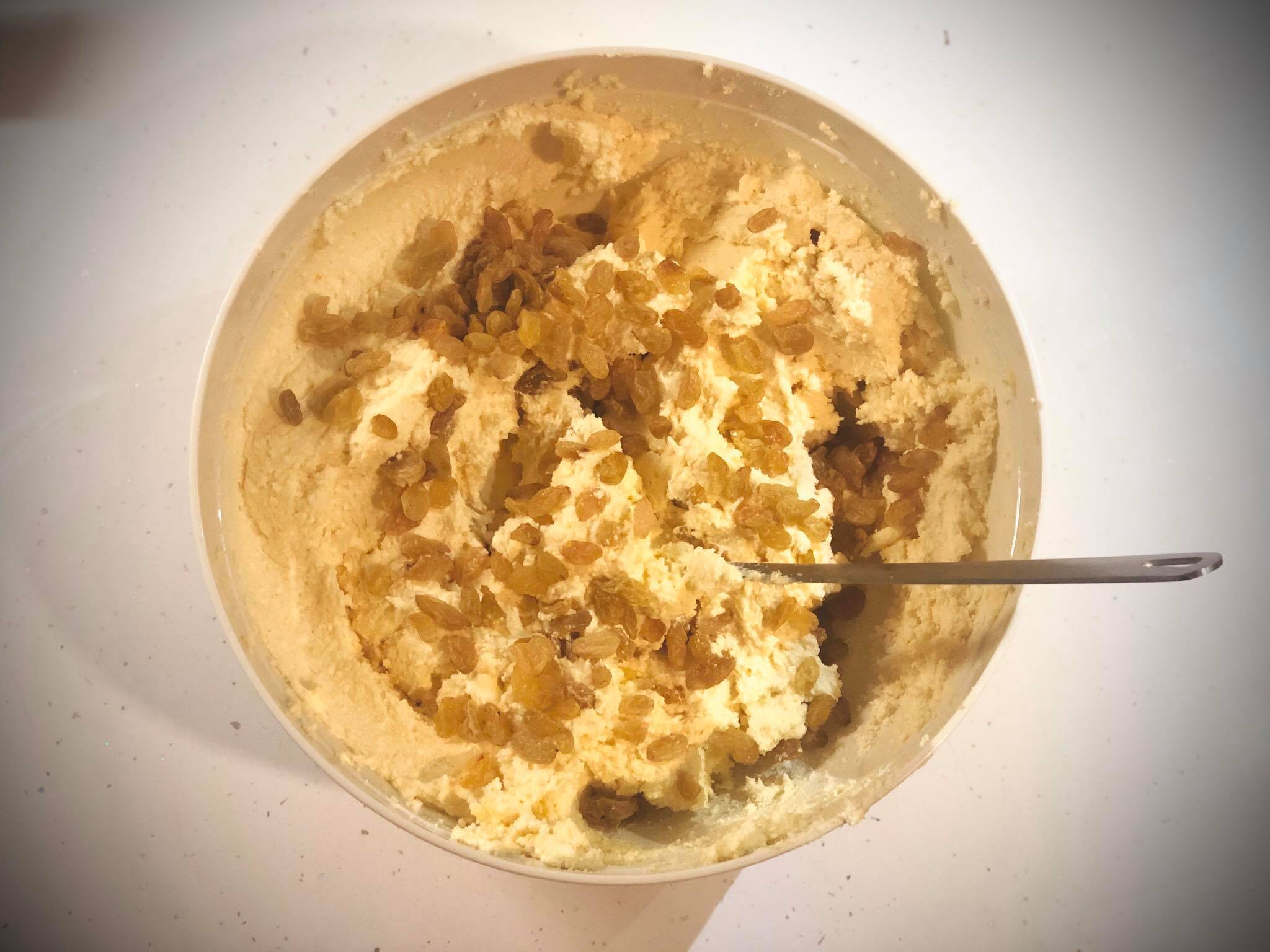 - ეტაპობრივად ამატებთ: კვერცხის გულს, ვანილს, შაქარს, ლიმნის ცედრას, ქიშმიშს