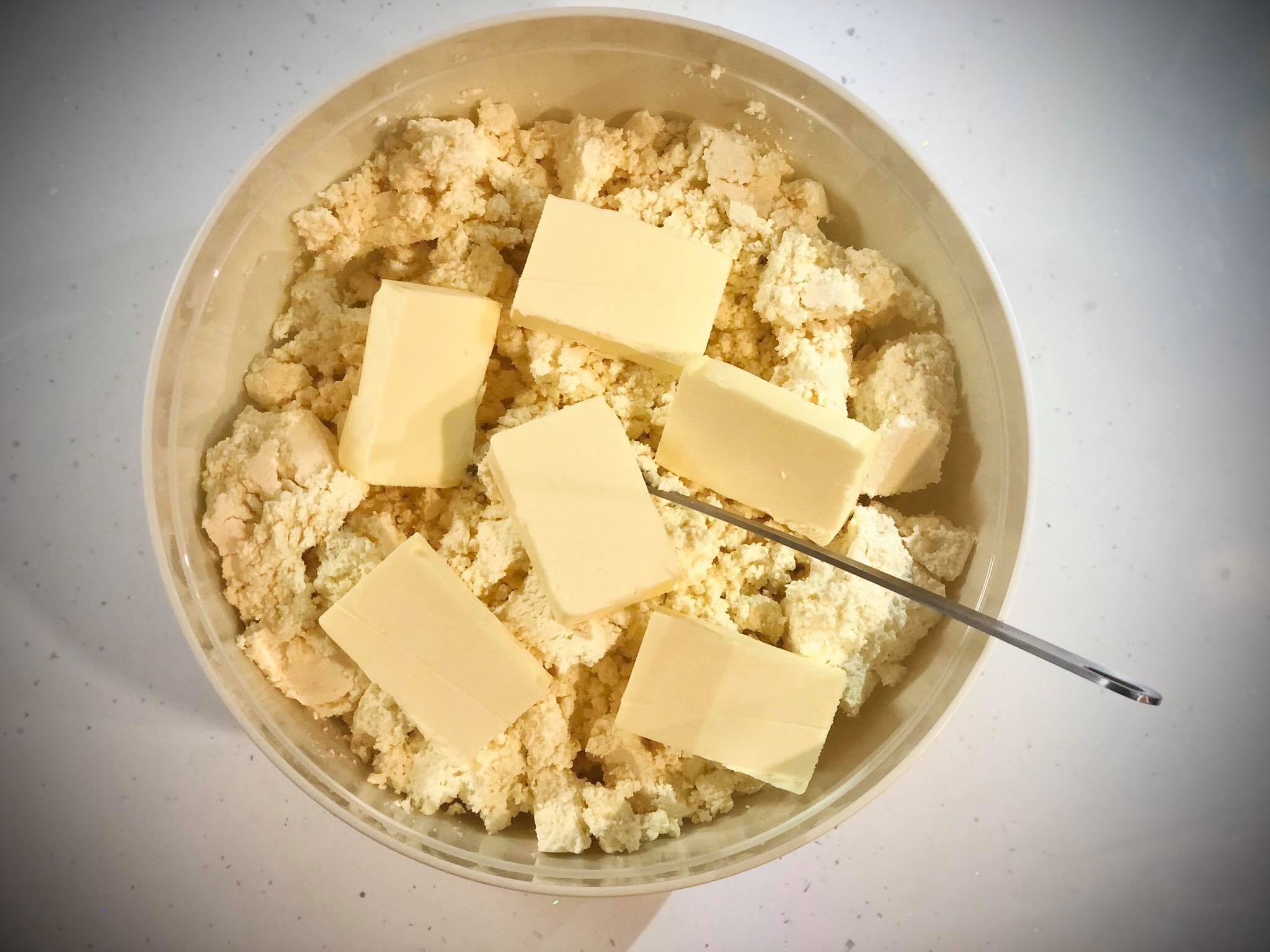 - 24 საათის შემდეგ , კარაქს სახლის ტემპერატურაზე გამთბარს, ჭრით პატარა კუბიკებად ამატებთ ხაჭოში და იწყებთ ხაჭოსთან ერთად გასრესვას,