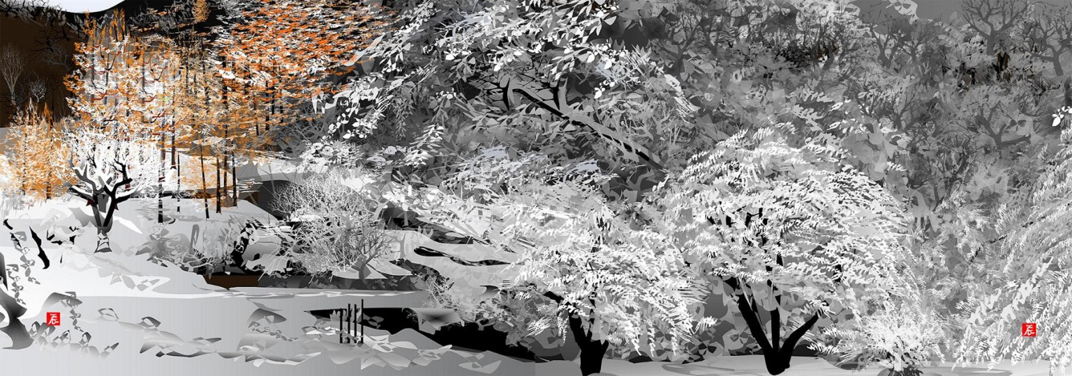 ვექტორული ხატვის ხელსაწყოების გამოყენებით, გრაფიკებისა და მარტივი გამოსახულებების ნაცვლად, ჰორიუჩიმ იაპონური სოფლის ცხოვრებიდან პანორამული სცენები დახატა.