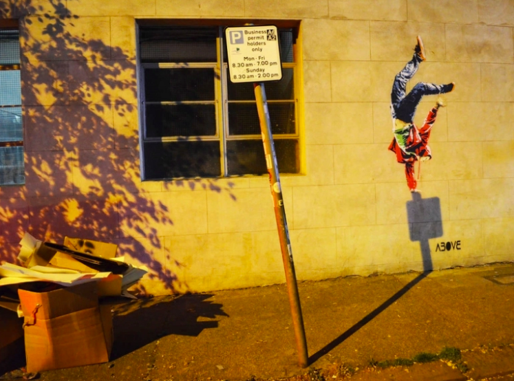 ამერიკელი ქუჩის მხატვარი Above (Tavar Zawacki) ამ ნამუშევრის (Timing is Everything) შესასრულებლად ადგილს შვიდი თვის განმავლობაში ეძებდა. მოთმინება ამ შემთხვევაში მთავარი უპირატესობაა, რადგან ნახატი სრულყოფილად მხოლოდ საგზაო ნიშნიდან დაცემული ჩრდილით აღიქმება.