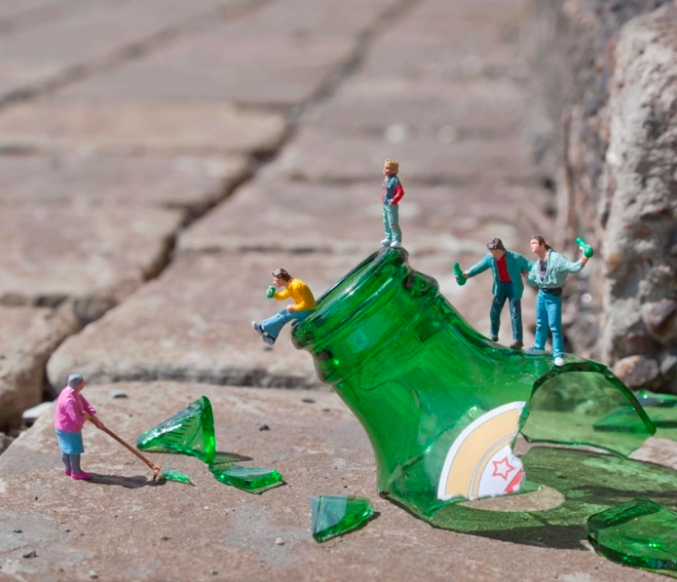 არავინ აკეთებს მინიატიურებს Slinkachu-ზე უკეთესად. იგი წლების განმავლობაში ამზადებდა ამ დეტალებს, ყოველდღიურ საგნებს მისი სცენების შთაგონებისთვის იყენებდა. გატეხილი შუშის ბოთლი ამ შემთხვევაში მიგდებული ნაგავი კი არა, ხმაურიანი თავშეყრის სცენაა, რომელსაც მოულოდნელად “დედა” შეესწრო.