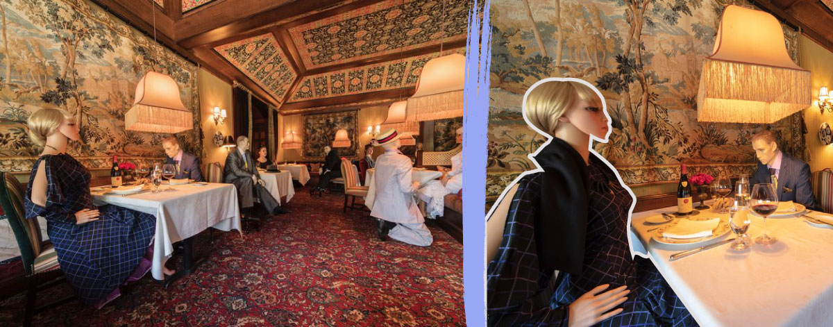 ვაშინგტონში მდებარე Virginia Inn-ის ამ რესტორნის ნახევარი მანეკენებით შეივსო, სადაც თითოეულ მაგიდასთან სხვადასხვა სცენა თამაშდება – ბიზნეს შეხვედრიდან დაწყებული, აქ ხელის თხოვნის პროცესის ნახვაც კი შეიძლება. ყველაფერი – მანეკენების ჩაცმულობა, თმის ვარცხნილობა და მაკიაჟიც 1940-იანი წლების სტილშია გადაწყვეტილი. ისინი ზუსტად ადამიანის პარამეტრების მიხედვით შექმნეს. არის მიმტანიც, რომელსაც ასწავლეს, თუ როგორ გაუმასპინძლდეს იმიტირებულ სტუმრებს ღვინით. პატრიკ ოკონელმა, რესტორნის მფლობელმა და შეფმზარეულმა, ასევე James Beard Award-ის გამარჯვებულმა, შეიმუშავა კონცეფცია იმისთვის, რომ ამ ჩახლართული სცენებით გამკლავებოდა სახელმწიფო რეგულაციებს და გამხდარიყო კორონავირუსის პანდემიისას ნათელი წერტილი.