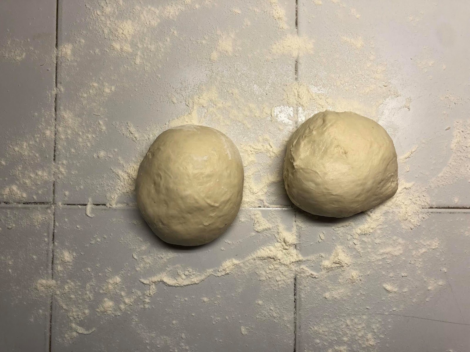 ღრმა ჭურჭელში ჩავყაროთ ფქვილი და მარილი. გავაკეთოთ შუაში ჭა, ჩავდოთ დარბილებული კარაქი და დავამატოთ საფუვრიანი წყალი. მოვზილოთ რბილი ცომი, ნელ-ნელა ვამატოთ თბილი წყალი. ბოლოს შევურიოთ 1 ს/კ ზეთი, დავაგუნდავოთ და დავტოვოთ შეფუთული 1-1,5 საათი. ცომი რომ ამოვა, ისევ მოვზილოთ. 1 საათში ამოვიღოთ და დავყოთ 250-გრამიან ბურთებად.