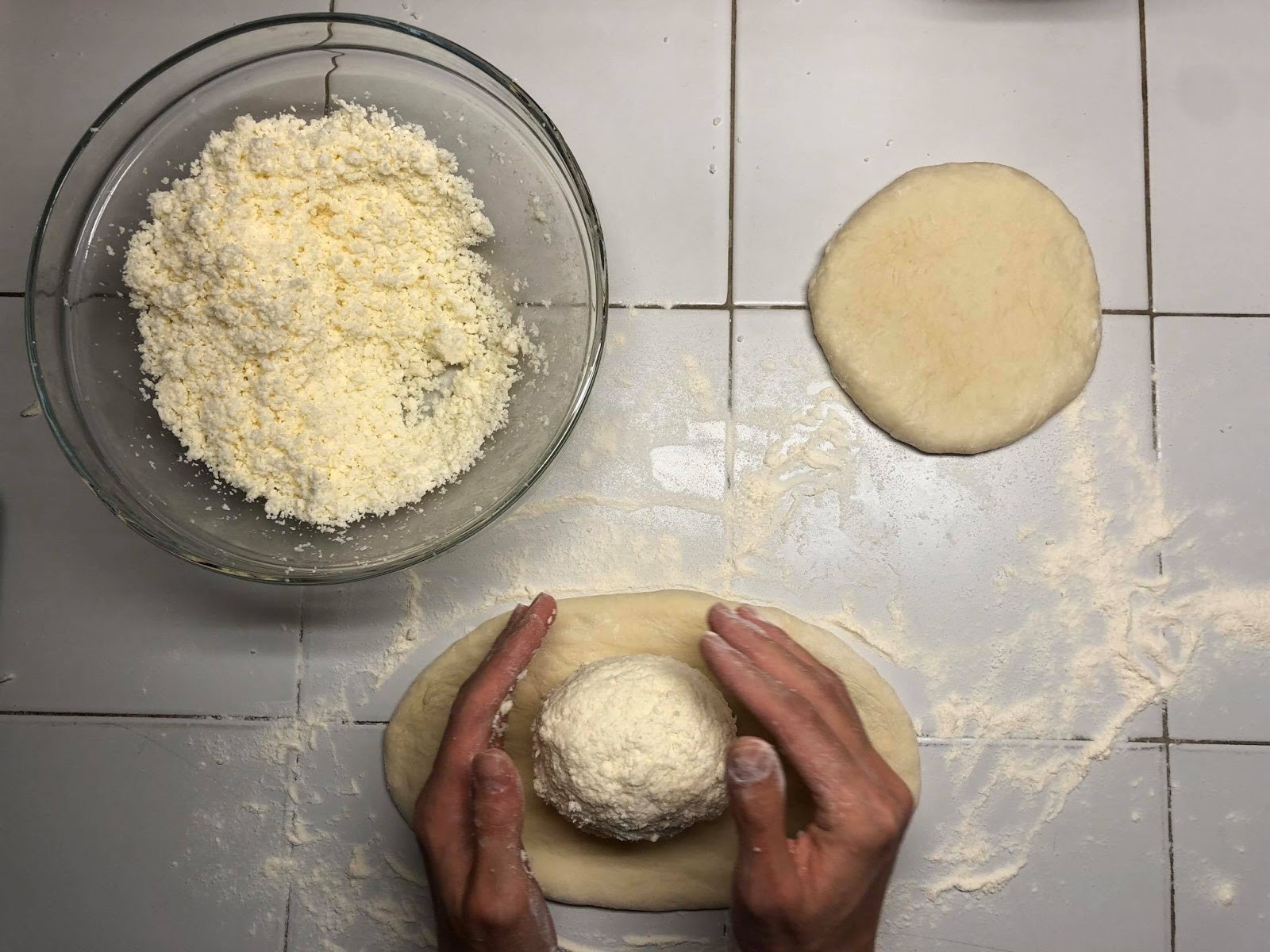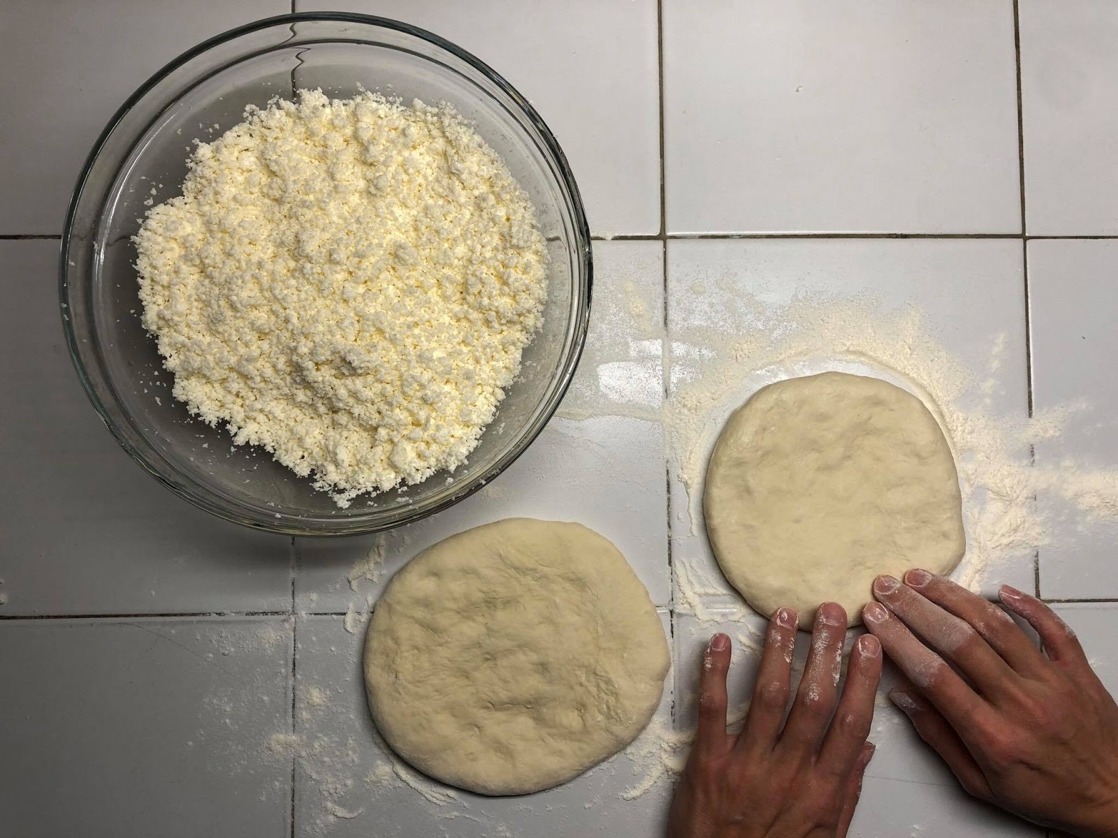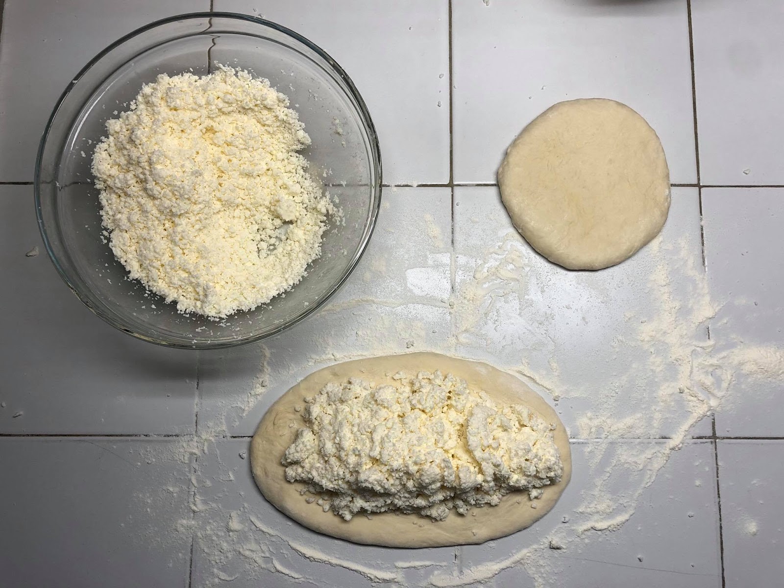 - 250 გრამ ცომის ბურთულაზე ავიღოთ 250 გრამი ყველი