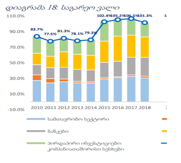 რაც შეეხება მშპ-სთან მიმართებას, ფინანსთა სამინისტროს მიერ გამოქვეყნებული ინფორმაციის თანახმად, 2019 წლის პირველ ნახევარში მთლიანი საგარეო ვალი მთლიანი შიდა პროდუქტის 104.7 პროცენტს შეადგენდა.