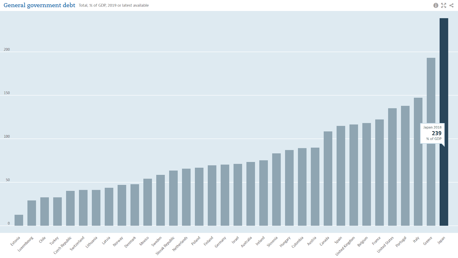 თუმცა, როგორც აღვნიშნეთ, უფრო სწორი საზომია, თუ საგარეო ვალის მშპ-სთან შეფარდების სტატისტიკურ მონაცემებს შევხედავთ. 2019 წლის მონაცემებით, ამ მხრივ ყველაზე მაღალი მაჩვენებელი იაპონიას აქვს, რომლის საგარეო ვალიც ქვეყნის მშპ-ს 239%-ს შეადგენს.