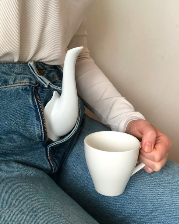 ავიღოთ მისი საყვარელი კლასიკური თეთრი ფაიფურის ჩაიდანი, რადგან მის შემოქმედებაში ამ ობიექტს მრავალმხრივი გამოყენება აქვს. შეგიძლიათ ჩაი სახელოდან, ცხვირიდან დალიოთ, ან პერსონალური ჩაის პაკეტი შექმნათ.