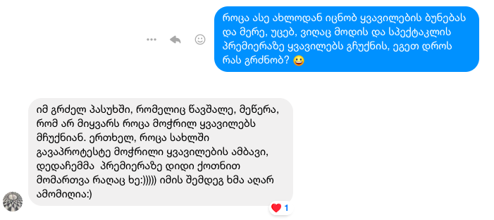 ნატა: ვირუსია, ოღონდ არ კლავს:) “გადადება”, გინდა “დაინფიცირება”, ყველა სფეროში აუცილებელი მგონია. მარტო ხელოვნებას არ აქვს ექსკლუზივი:) არაფერი გაკეთდება ისე, რომ ერთმა ადამიანმა მეორეს არ გადასდოს ის, რაც შემდეგ ერთად უნდა გააკეთონ. სასიყვარულო ისტორიას ჰგავს ერთი იდეის გარშემო გაერთიანებული ადამიანების ნებისმიერი წამოწყება. ფინალიც ასეთი აქვს – ან შედგება, გადაედება და რაღაც შეიქმნება, ან – არა. იდეაც კვდება.