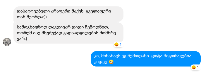 ნატა: ერთი ადგილი მაქვს აგარაკზე, დილას იქ ყავას ვსვამ. ალუჩის ხეზე ჩამოკიდებული ჰამაკი-სავარძელი, გვერდით პატარა ხის მორზე, პატარა ბრტყელი ქვა დევს, სადაც საფერფლე და ყავის ჭიქა ეტევა. ეს არის ადგილი, სადაც დრო იკარგება. სადაც არც წარსულია, არც მომავალი, არც მე. ძალიან მიყვარს ეს ნახევარსაათიანი გაქრობა. ეს ქალაქი კი ჩემთვის წარსულიცაა და მომავალიც. აწმყოს ვერ ვგრძნობ, აწმყო ჩემთვის არ არსებობს. არსად.