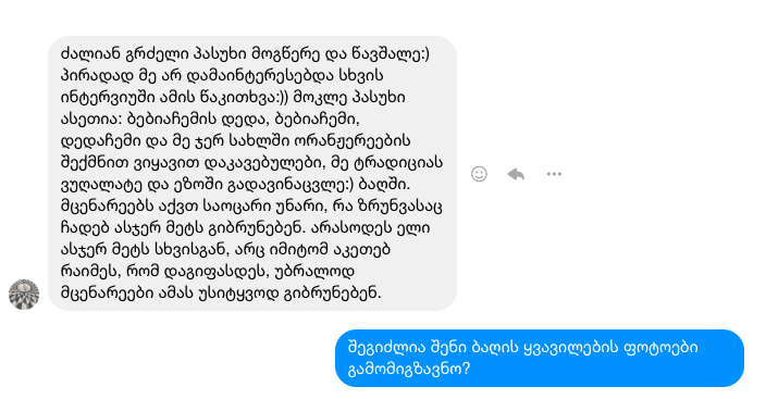გურამი: აი, ხეებიო. ბაღის მაგიაზე მინდა გკითხო. პირველად როდის დაიწყე მცენარეებთან ასე ახლო ურთიერთობა? რა ტიპის ენერგიების მიმოცვლა გაქვთ?
