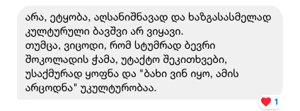 მაშინ მე მიწოდეს უკულტურო, მაგრამ ახლა ვფიქრობ, რომ თავად ეს ქალი იყო უკულტურო და თანამდებობისთვის შეუფერებელი, რადგან რვა წლის ბავშვში ცნობისმოყვარეობა თუ ბუნებრივ ამბად არ მიგაჩნია, არ უნდა იმუშაო სკოლაში.