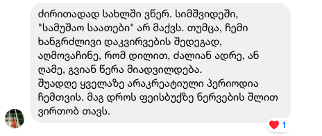 გურამი: შენი წერის პროცესი როგორია? ცოტა ბოჰემური ელფერი დაჰკრავს და მუშაობა (თუნდაც ფიქრის დონეზე) გრძელდება შესვენების გარეშე და გრძელდება ყველგან, თუ შეგიძლია “ოფისურად” წინასწარ განსაზღვრულ დროს შეწყვიტო წერა, იმიტომ რომ სამუშაო საათები გავიდა? სად წერ, სახლში თუ ოფისში?