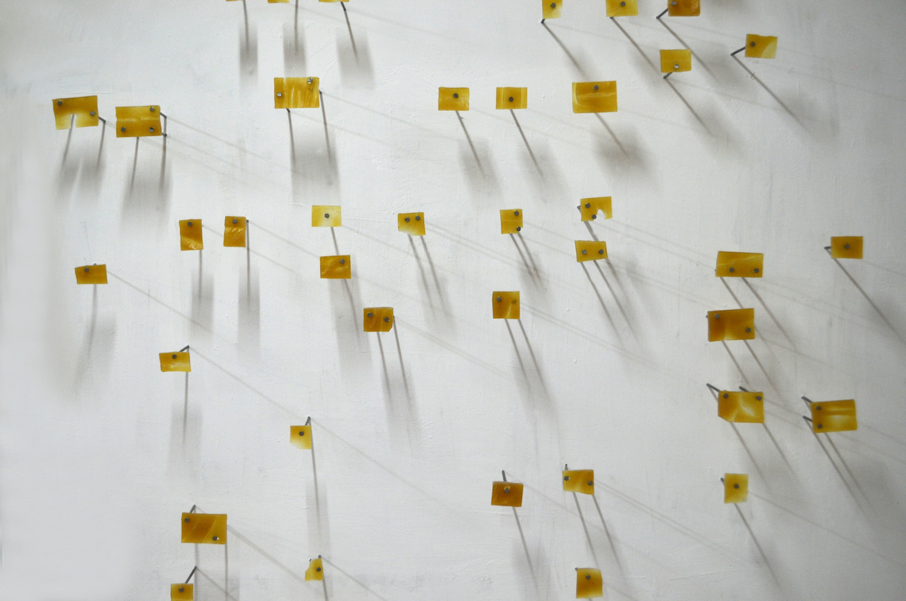 ძალიან საინტერესო მასაა ცვილი. თავიდან, პირველი ინსტალაცია რაც გავაკეთე, მასალის გასაგებად სავარჯიშოსავით, მოთელვასავით იყო. მეორე ნამუშევარში, “გამოუყენებელ ხმლებში” კი მგონია, რომ უფრო კარგად მაქვს გააზრებული. ცვილი ამ ნამუშევარში ქმნის ერთგვარ სრიალა ბარიერს თავისი ცხიმიანი სტრუქტურიდან გამომდინარე, ბარიერს უქმნის “ხმლებს”, ანუ აგრესიას, შეჯიბრს და რაც მთავარია ძალაუფლებას. “გამოუყენებელი ხმლები” კი ვერ მოძრაობენ, ვერ ასრულებენ თავიანთ ფუნქციას, არიან თანაბარნი და ასე უმოძრაო მდგომარეობაში დარჩებიან ჩემთვის.
